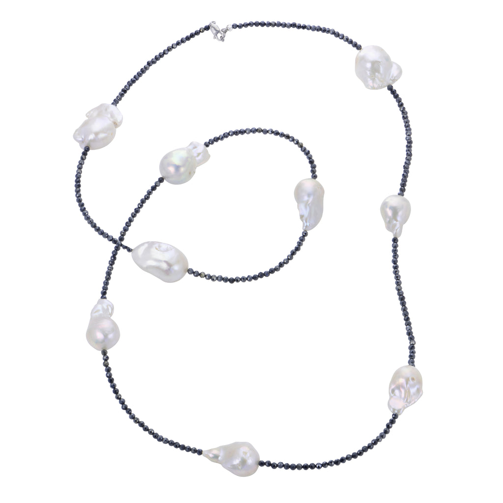 36" Very cool 13-15mm baroque shaped freshwater cultured pearls with black spinel beads and sterling silver clasp.