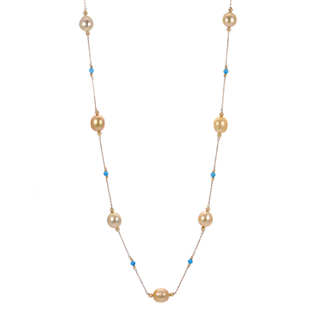 22" 14KY 9-10MM GOLDEN SS PEARL & SLEEPING BEAUTY TURQUOISE STATION NECKLACE