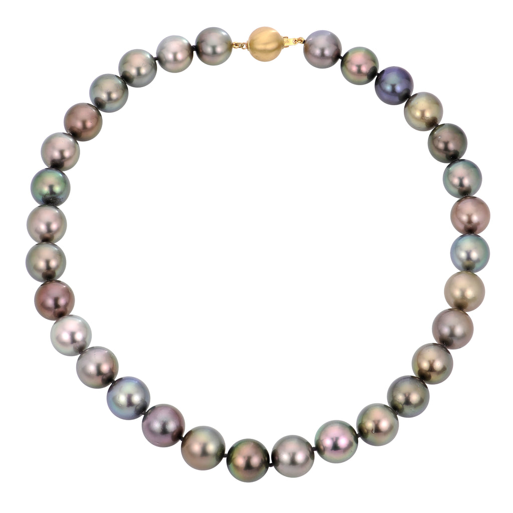 This large lustrous "AA" quality Tahitian strand is any cultured pearl lovers dream! At a jaw dropping 13-14mm this necklace will turn heads no matter what crowd you walk thru. These cultured pearls display a wide verity of the most desirable dark natural colors from green to aubergine and even shades of blue. Although cultured pearls of this incredible size often loose their luster that's not the case with this beauty as you can practically see yourself in the surface reflection of each cultured pearl. The surface quality of these cultured pearls is extremely clean with some very minor blemishes and inclusions. The large 12mm ball clasp has a brushed texture and is made in 14k gold.